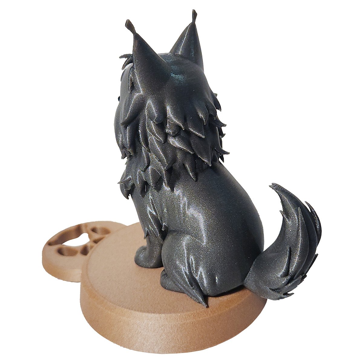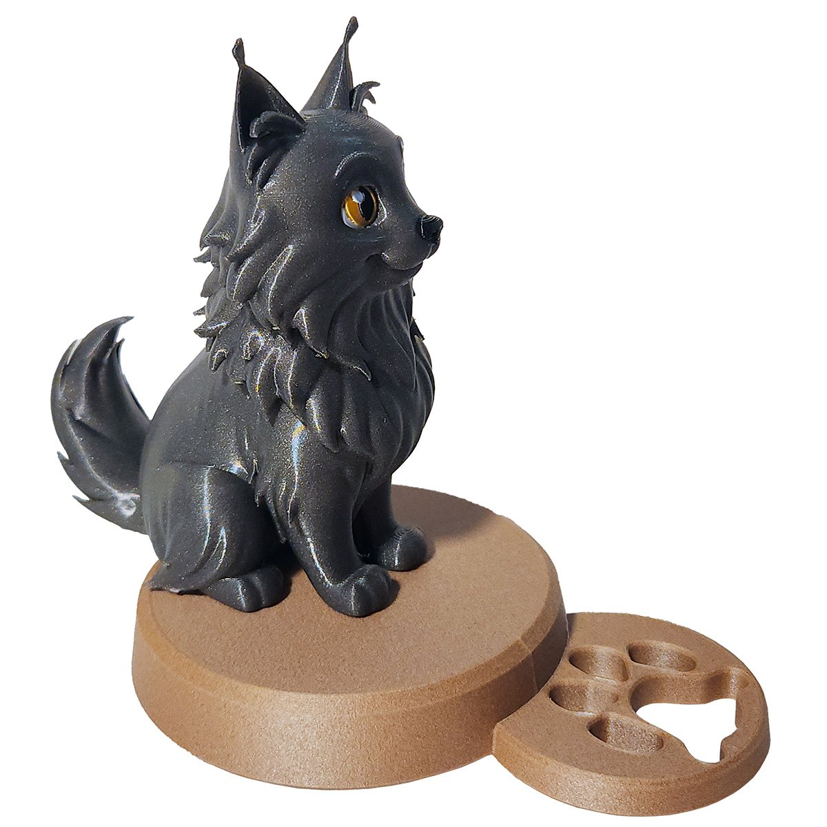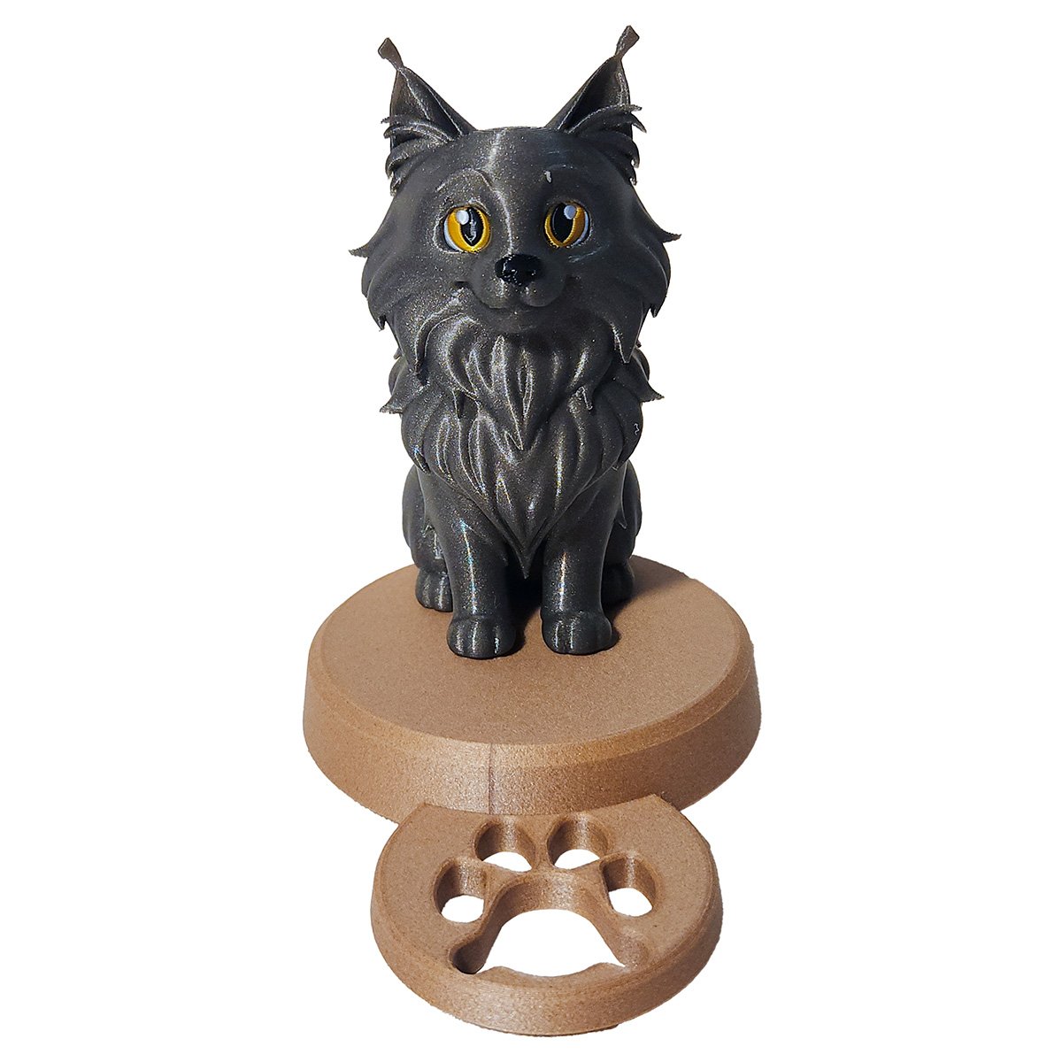 Loin des standards industriels, nous fabriquons chaque pièce à la demande dans notre atelier en France. Nous utilisons des matériaux écologiques (bioplastique à base d’amidon de maïs) et réalisons les finitions à la main pour honorer la nature rustique de ce chat originaire du Maine.